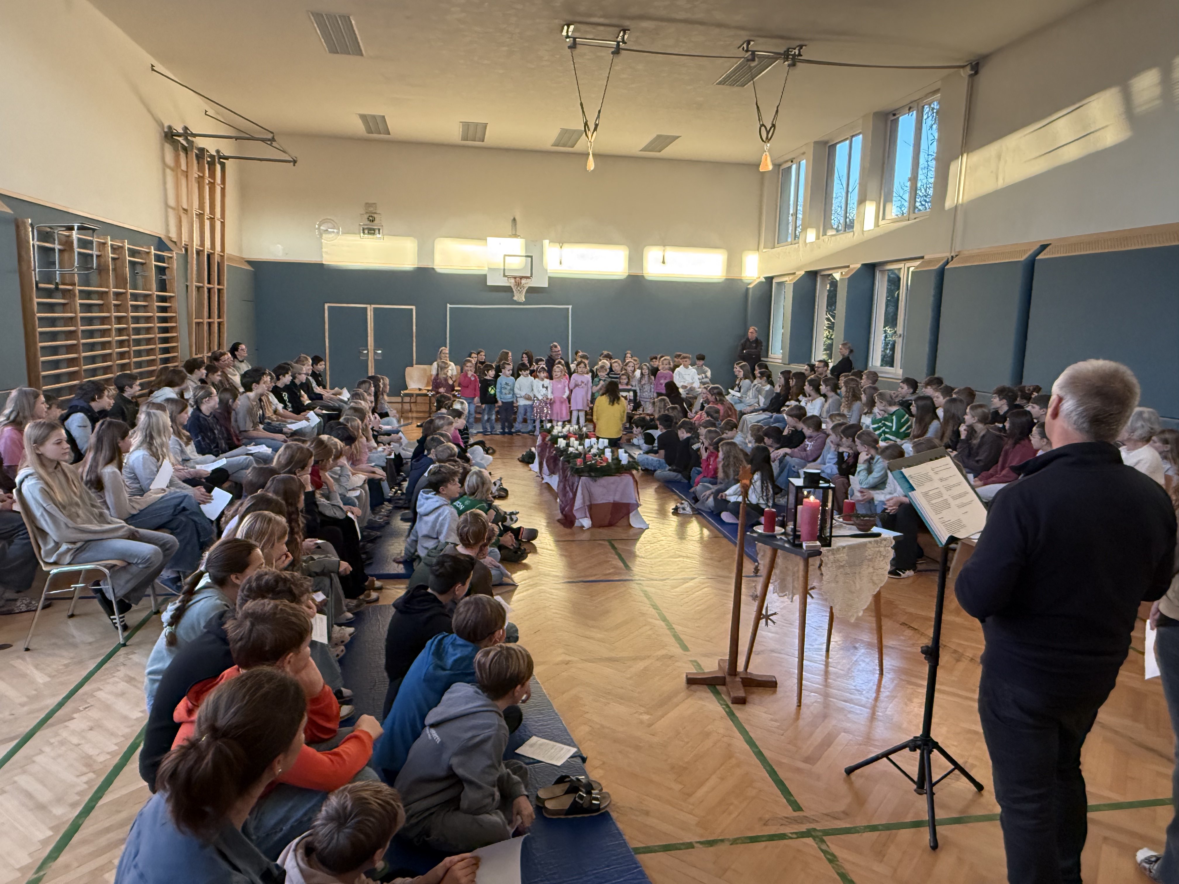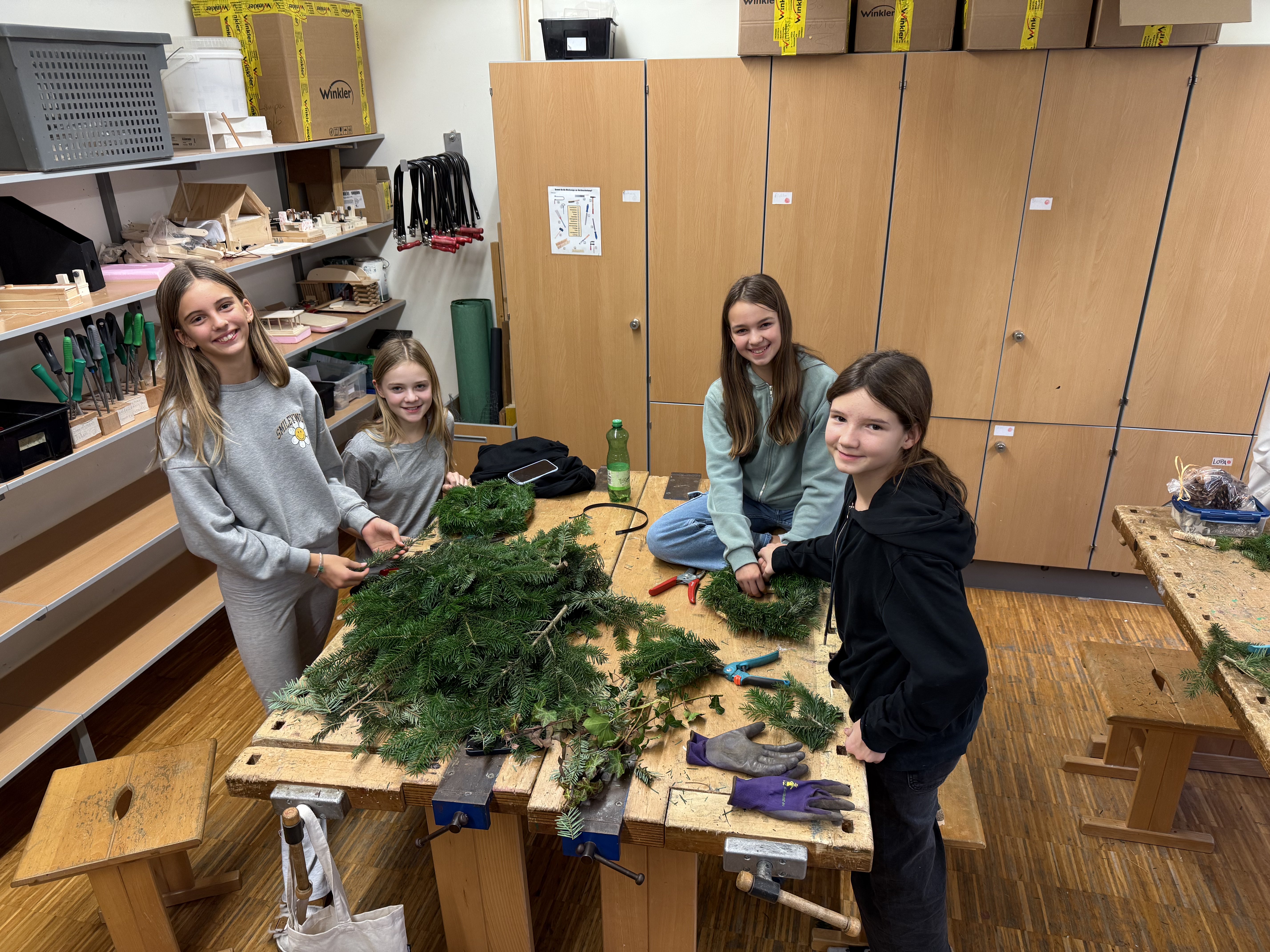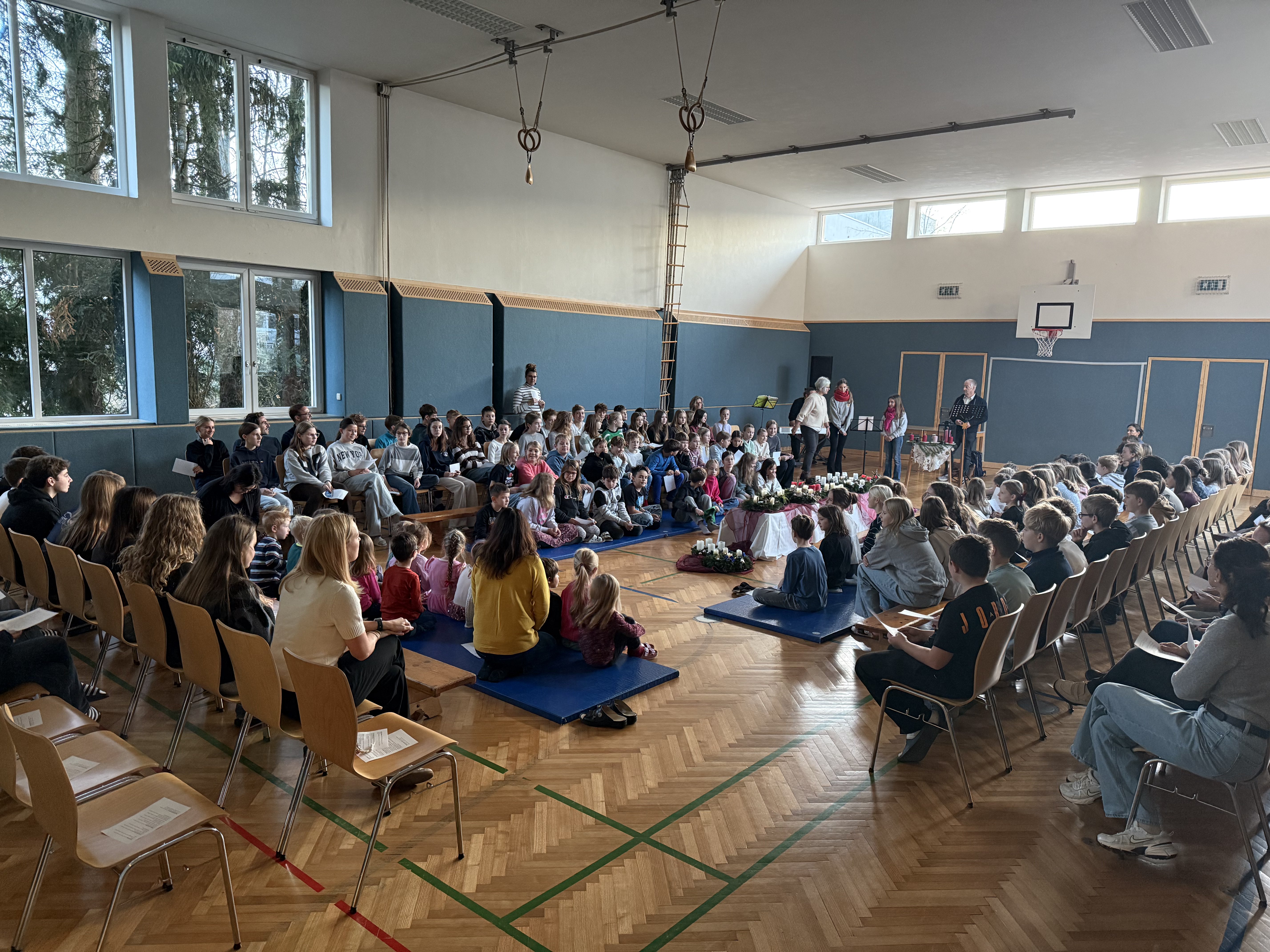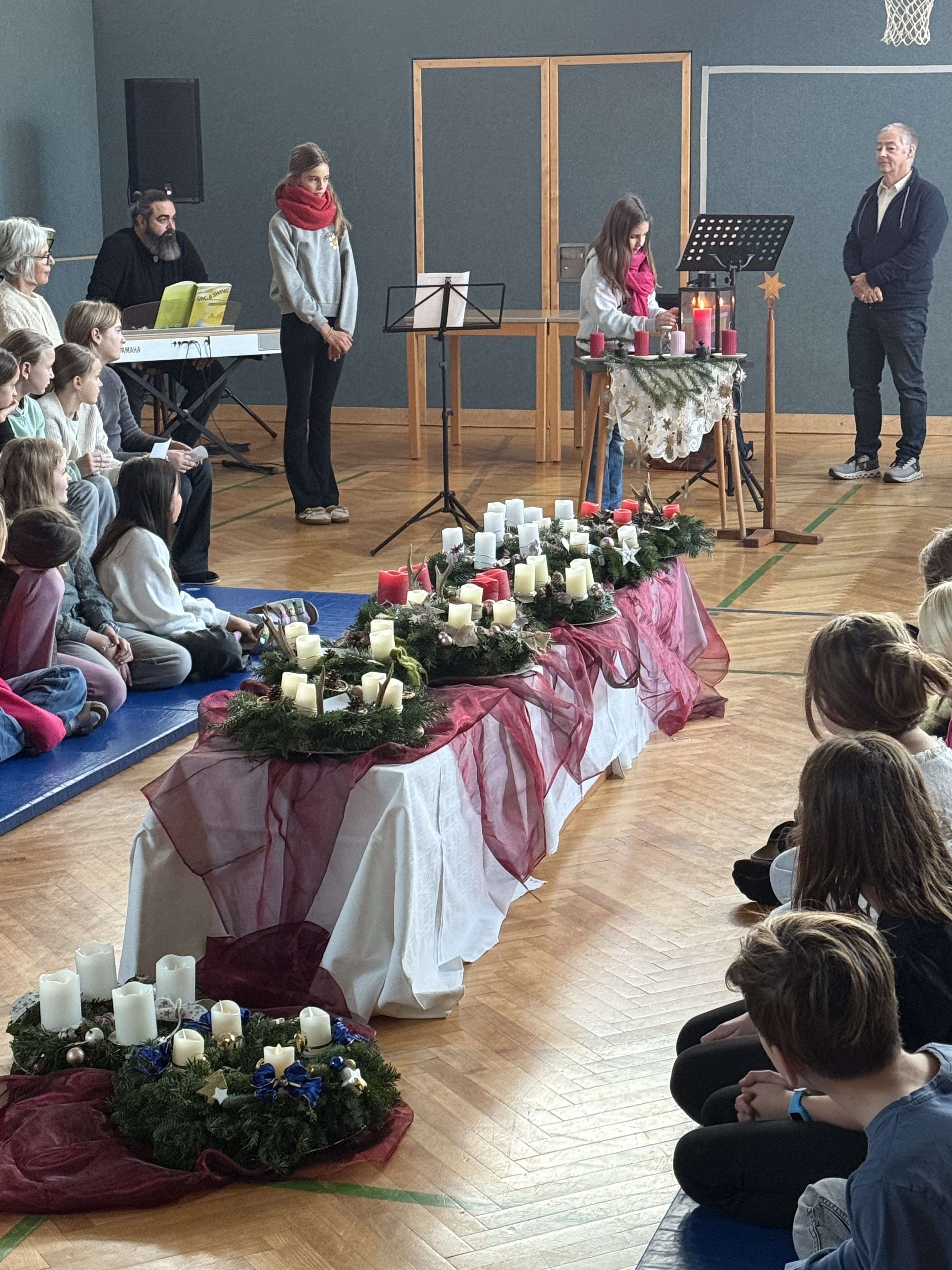 Die Schülerinnen der 2a- und 2b-Klasse haben gemeinsam mit Frau Steinwendtner Adventkränze gebunden, welche von Herrn Griesser anschließend feierlich im Turnsaal geweiht wurden.