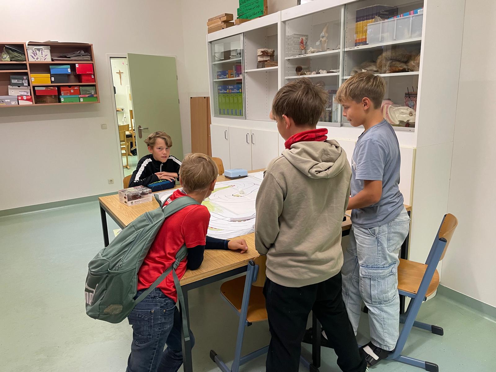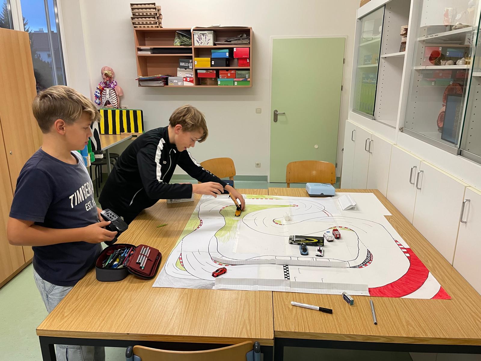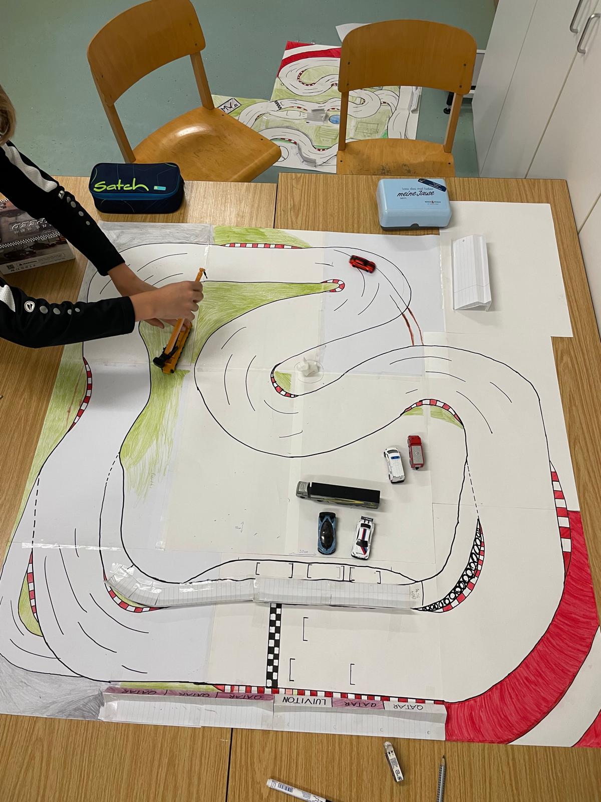 Die 2a-Klasse begeistert sich in den Pausen für ihre selbst gestaltete Miniaturautorennbahn. Mit ferngesteuerten Autos sorgen sie für spannende Rennen und viel Spaß.