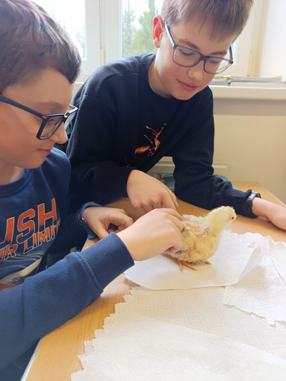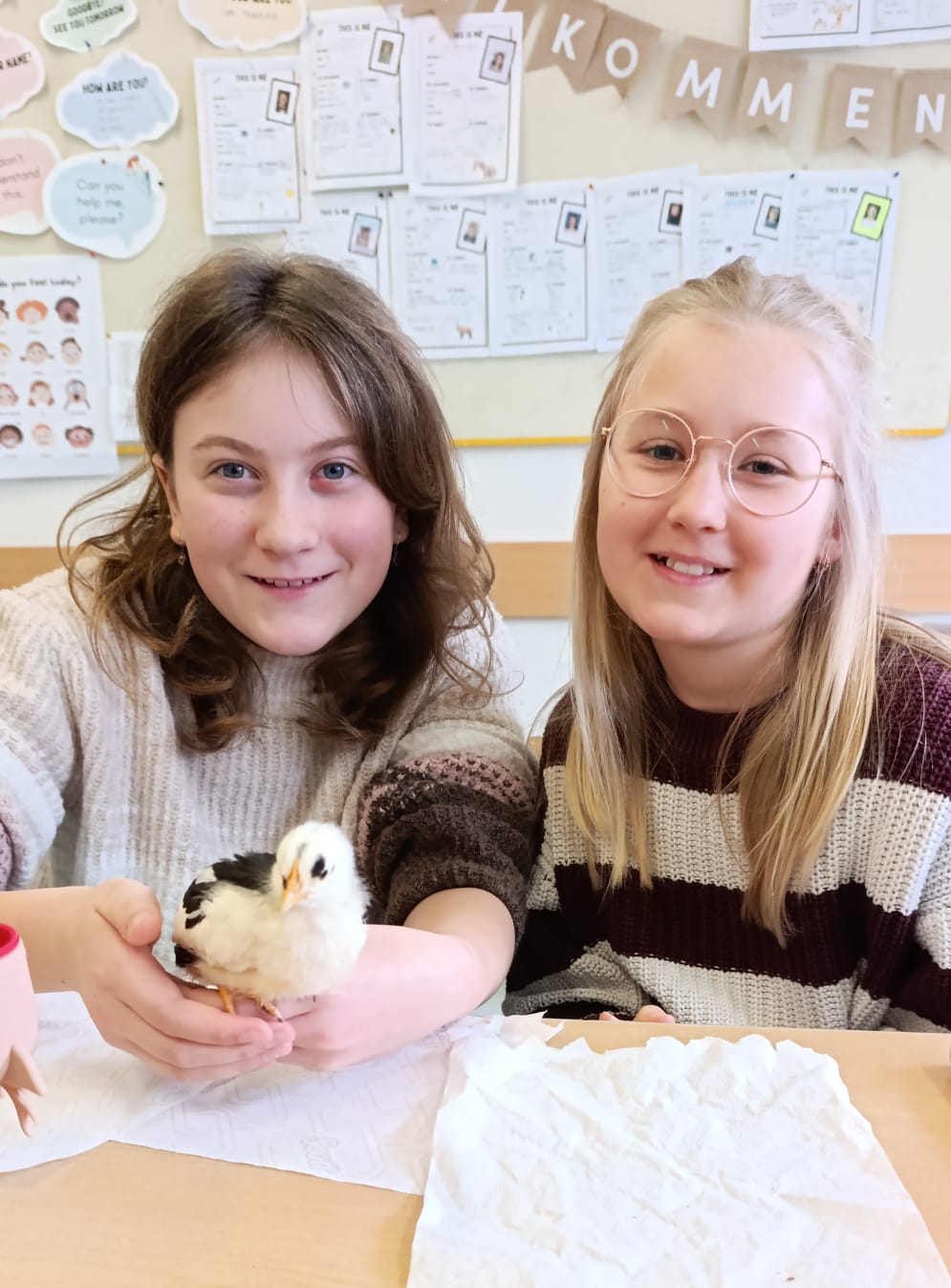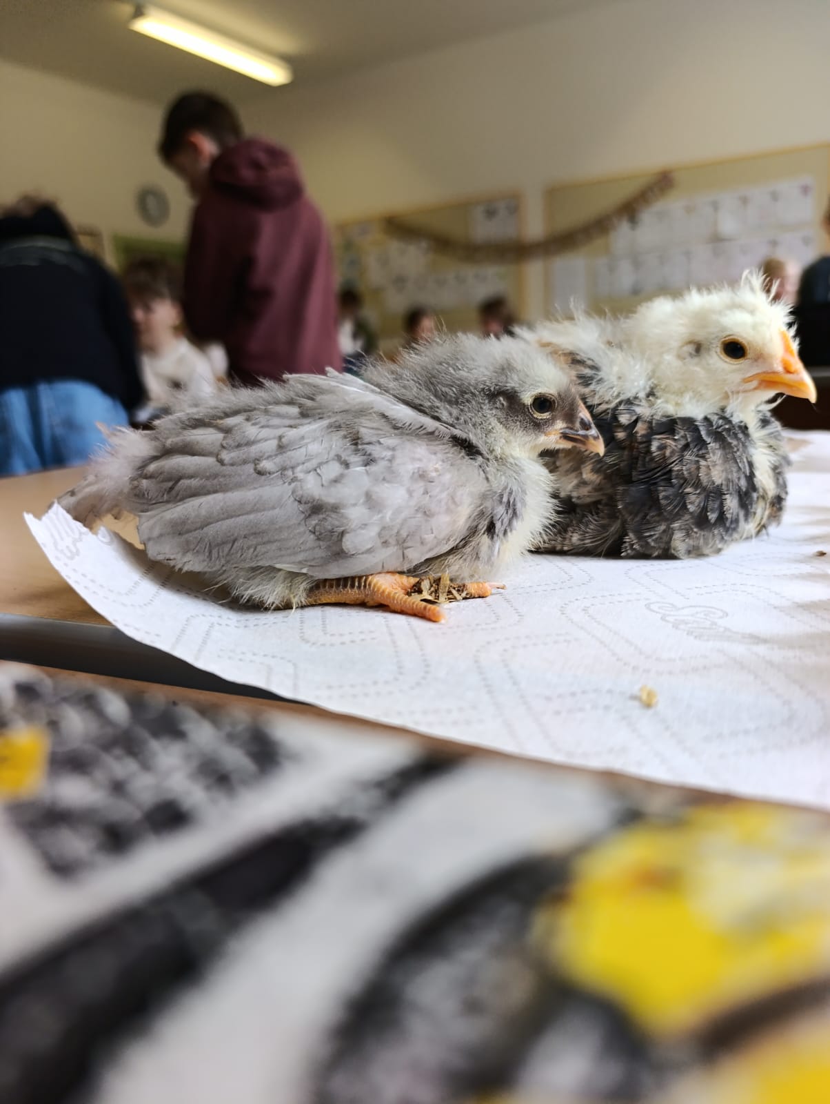 Die Schülerinnen und Schüler der 1B-Klasse freuten sich über den Besuch ihrer in der Klasse geschlüpften Küken, die inzwischen zu kleinen Hühnern herangewachsen sind. Dabei wurde das enorme Wachstum der Tiere seit ihrem Schlüpfen für alle eindrucksvoll sichtbar.