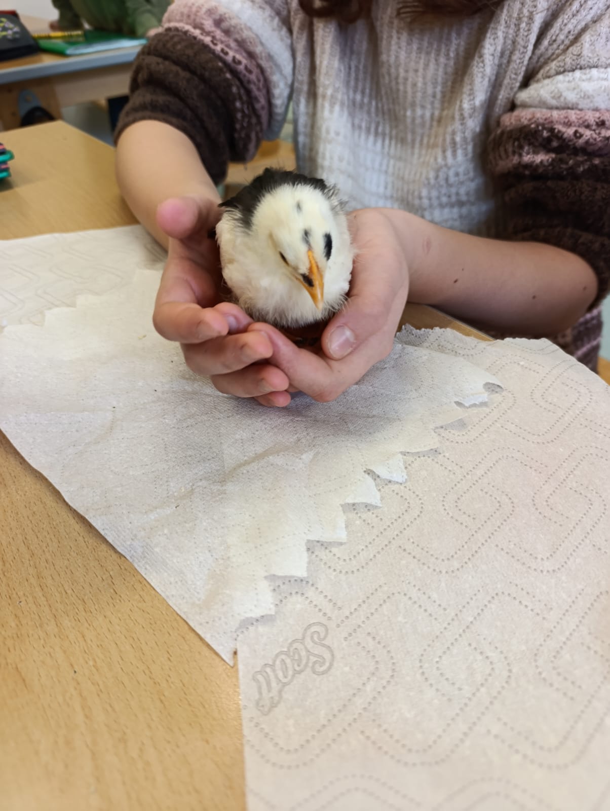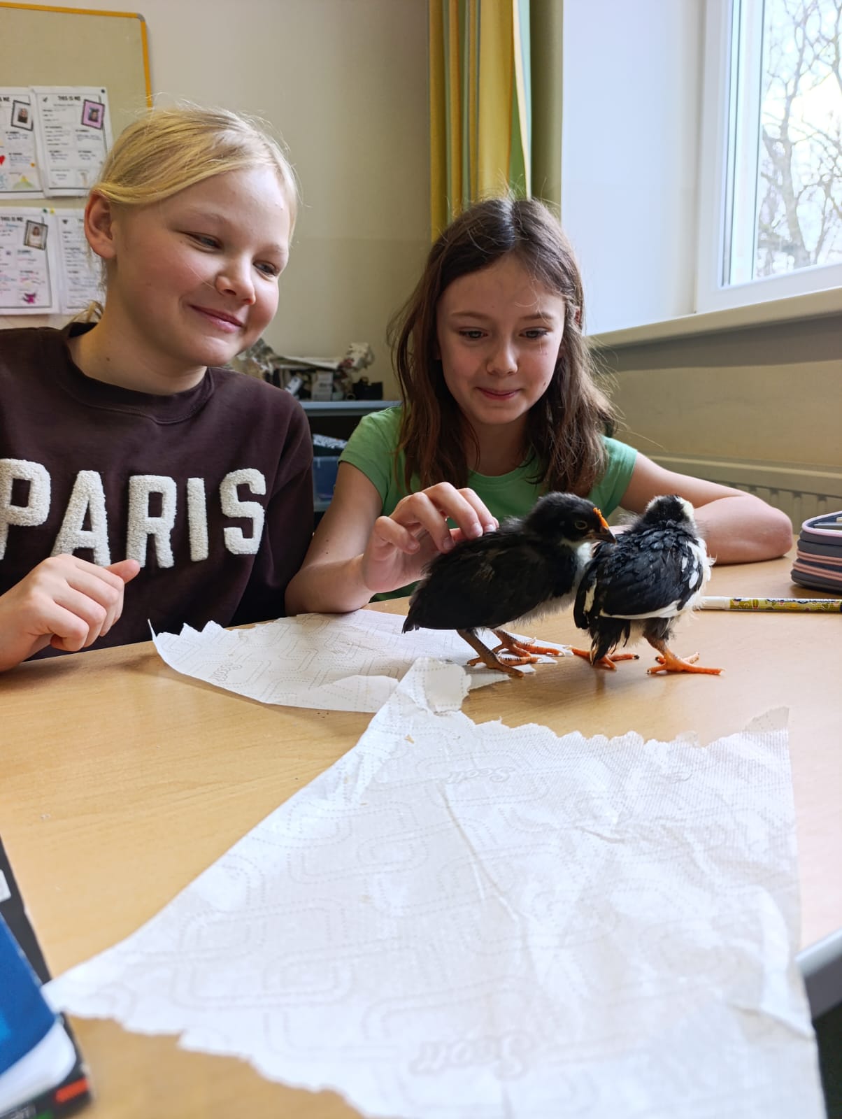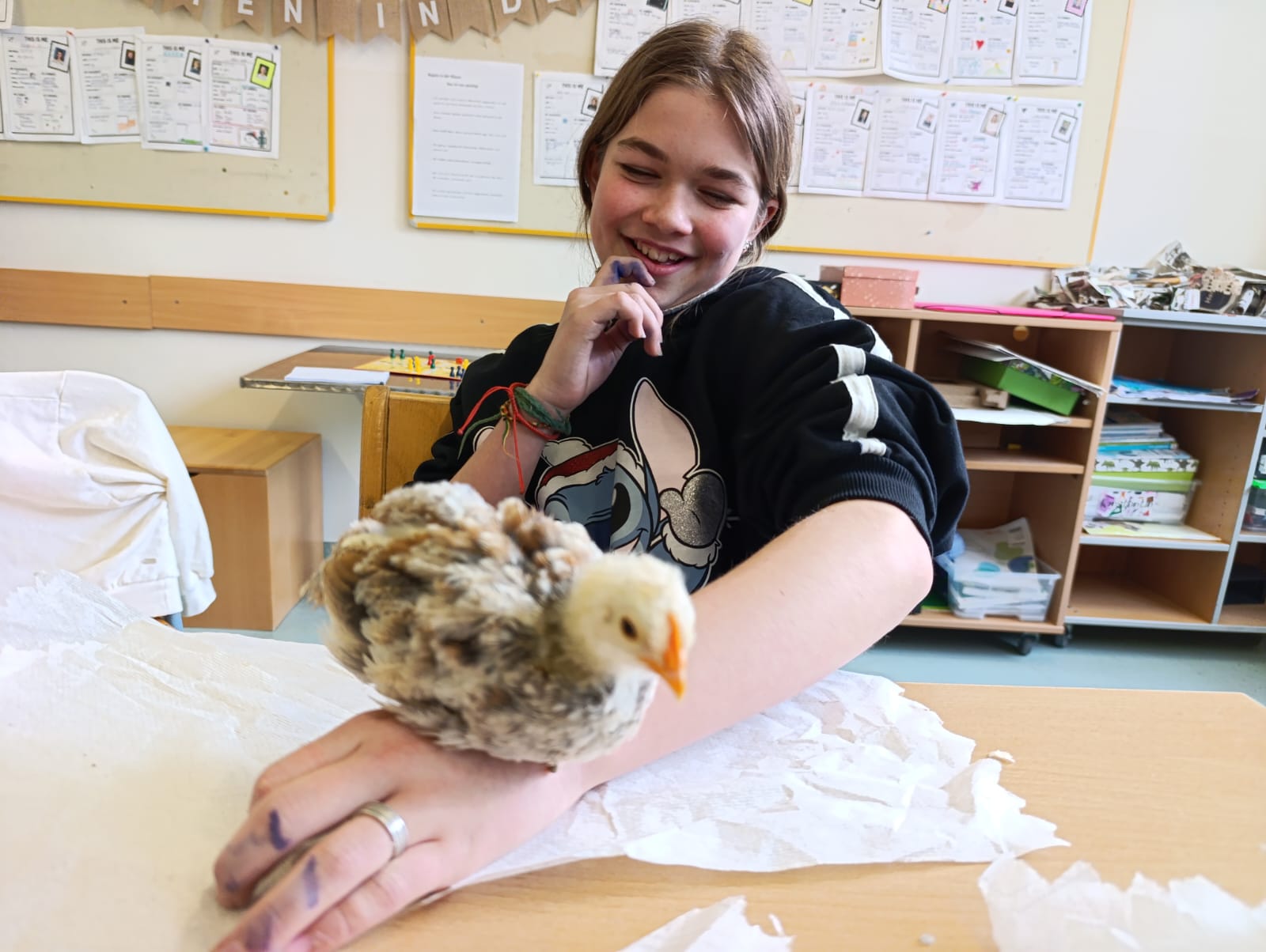 Die Schülerinnen und Schüler der 1B-Klasse freuten sich über den Besuch ihrer in der Klasse geschlüpften Küken, die inzwischen zu kleinen Hühnern herangewachsen sind. Dabei wurde das enorme Wachstum der Tiere seit ihrem Schlüpfen für alle eindrucksvoll sichtbar.