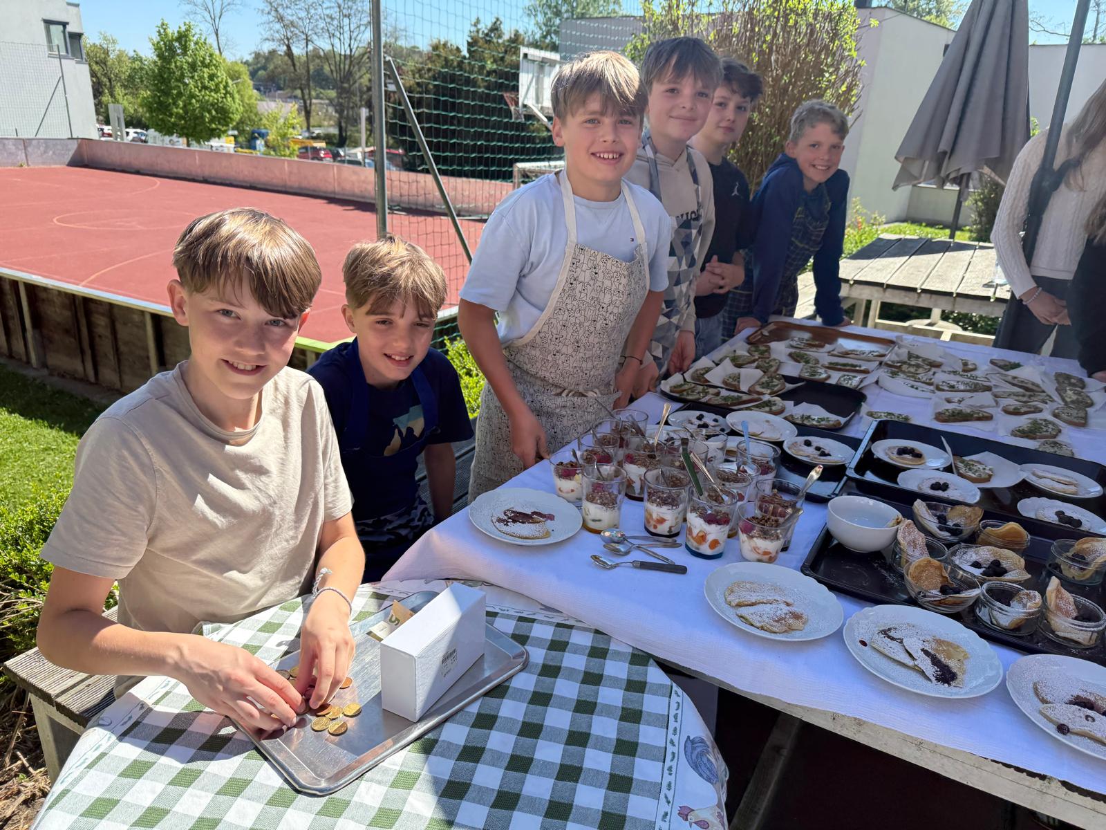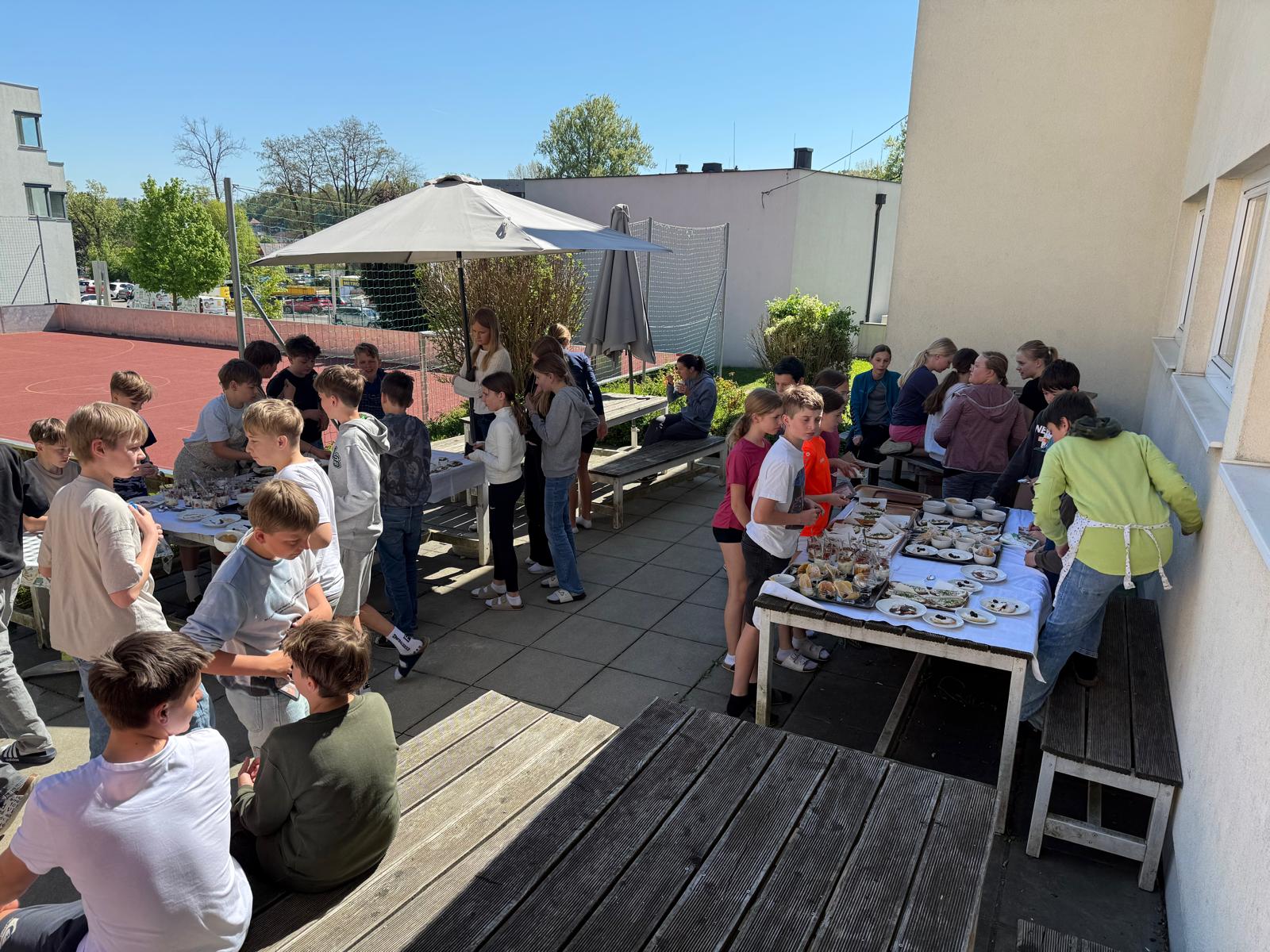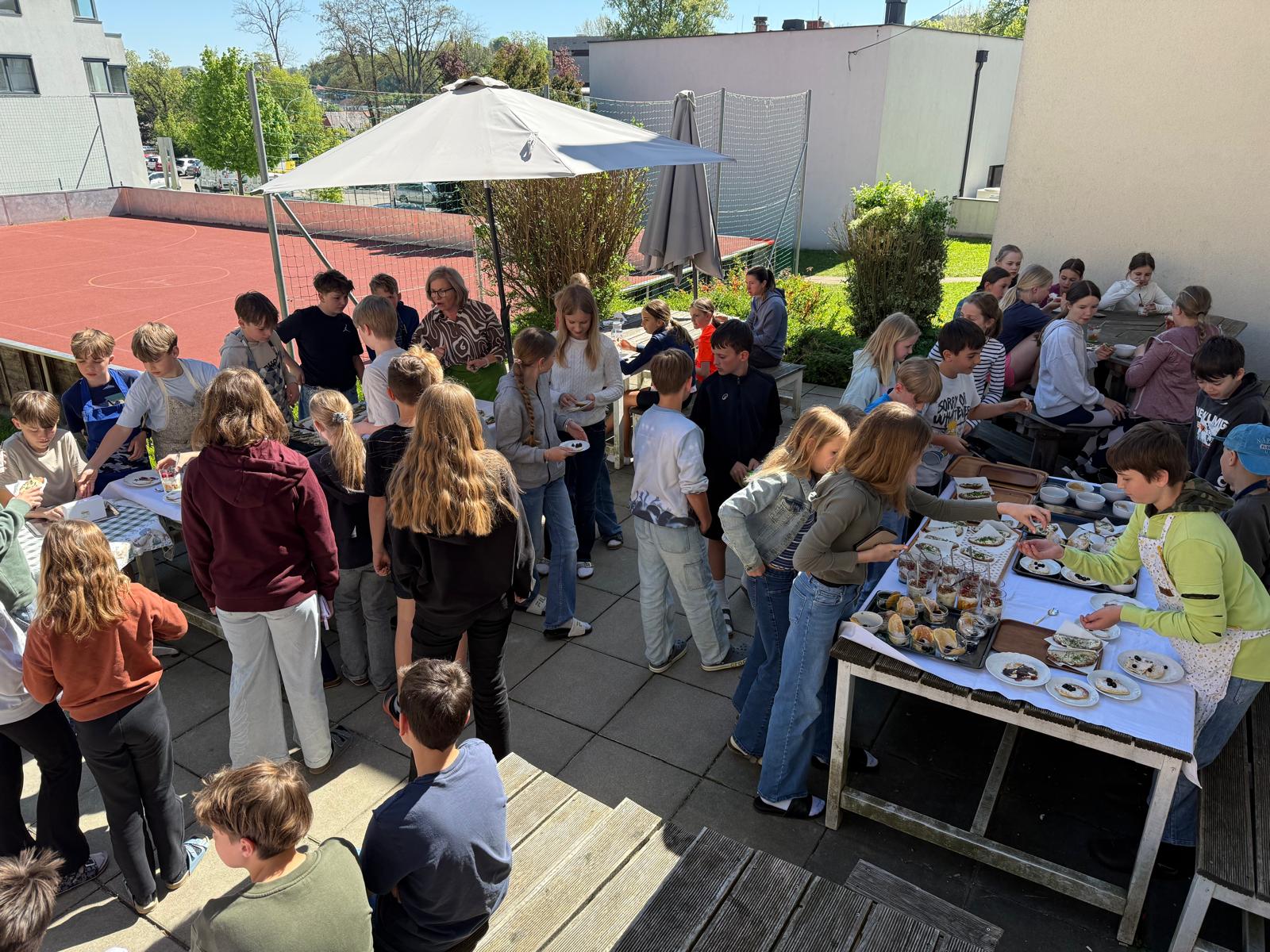 Die Burschen der 2ab-Klassen haben heute draußen auf der Terrasse mit viel Einsatz den Jausenverkauf organisiert. Bei frischer Luft, guter Stimmung und leckeren Snacks war der Verkauf ein voller Erfolg!